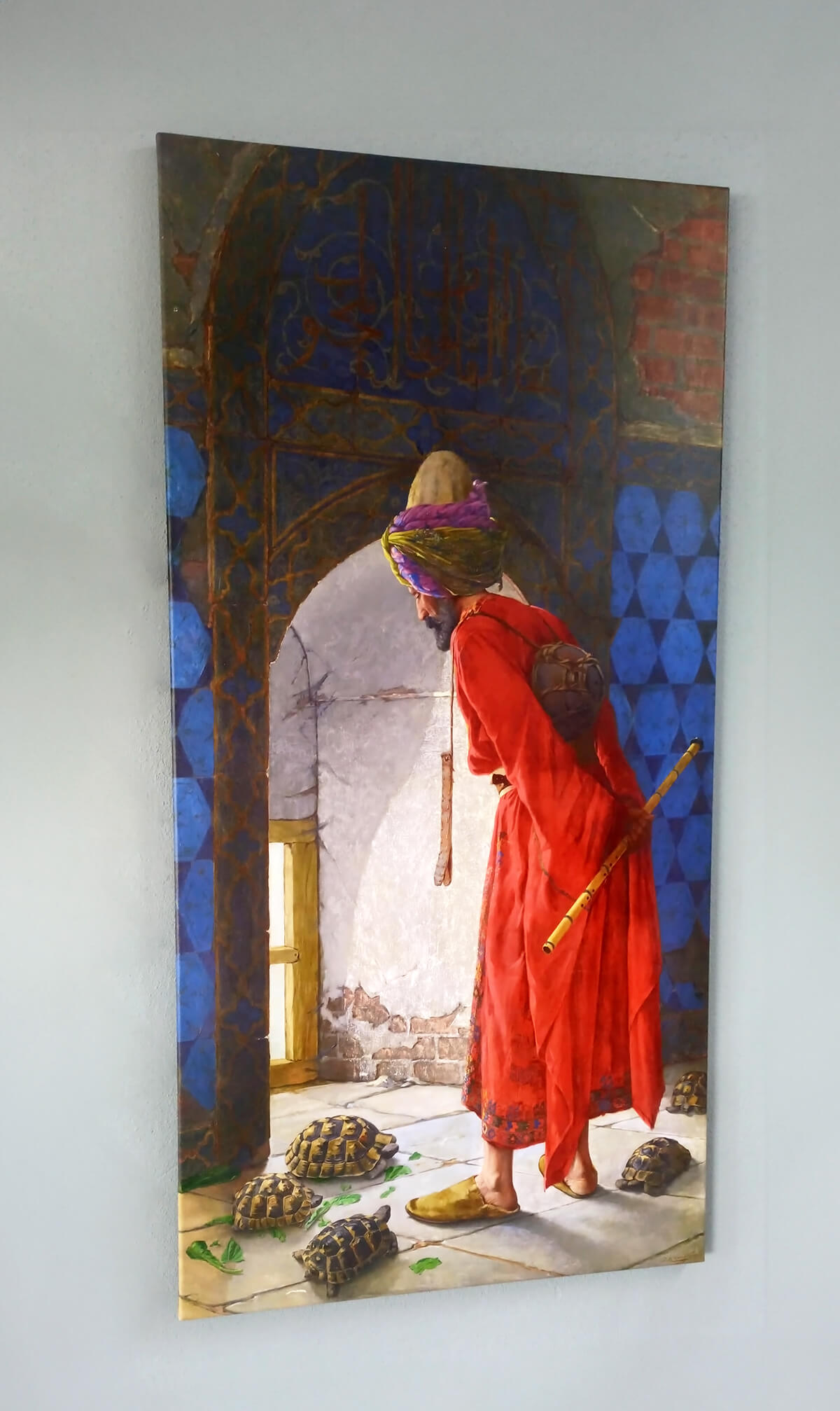Osman Hamdi’nin resimlediği sahnede yerdeki yeşillikleri yemekte olan kaplumbağaları düşünceli bir tavırla izleyen Doğulu giysiler içinde bir erkek figürü görürüz. Elinde bir ney tutmakta, sırtında nakkare veya kudüm cinsinden bir vurmalı çalgı durmaktadır. Önünde durduğu pencerenin üstünde yer alan sivri kemerli alınlıkta “Şifa’al-kulûp lika’al Mahbub” yani “Kalplerin şifası, Sevgiliyle (Hz. Muhammed) buluşmaktır” yazılıdır. Mekân olarak, sanatçının resimlerinde sıkça karşımıza çıkan Bursa Yeşil Cami’nin üst kat odası kullanılmış, figür için pek çok resminde olduğu gibi Osman Hamdi’nin kendisi modellik etmiştir. Adamın elinde, sırtında yer alan çalgılar derviş olabileceğini akla getirse de, başlığı Elbise-i Osmaniye’de “yemeniler dolanmış keçe kalpak” olarak tanımlanan “Mardinli Kürd” tipinin başlığına benzer. Osman Hamdi’nin Viyana’da bulunduğu sırada, bu giysiyle poz verdiği bazı fotoğraflar çektirdiği bilinmektedir. Sanatçı, figür ve mekan detayları için, başka resimlerinde de sıkça görüldüğü gibi çeşitli fotoğraflardan yararlanmış olmalıdır.